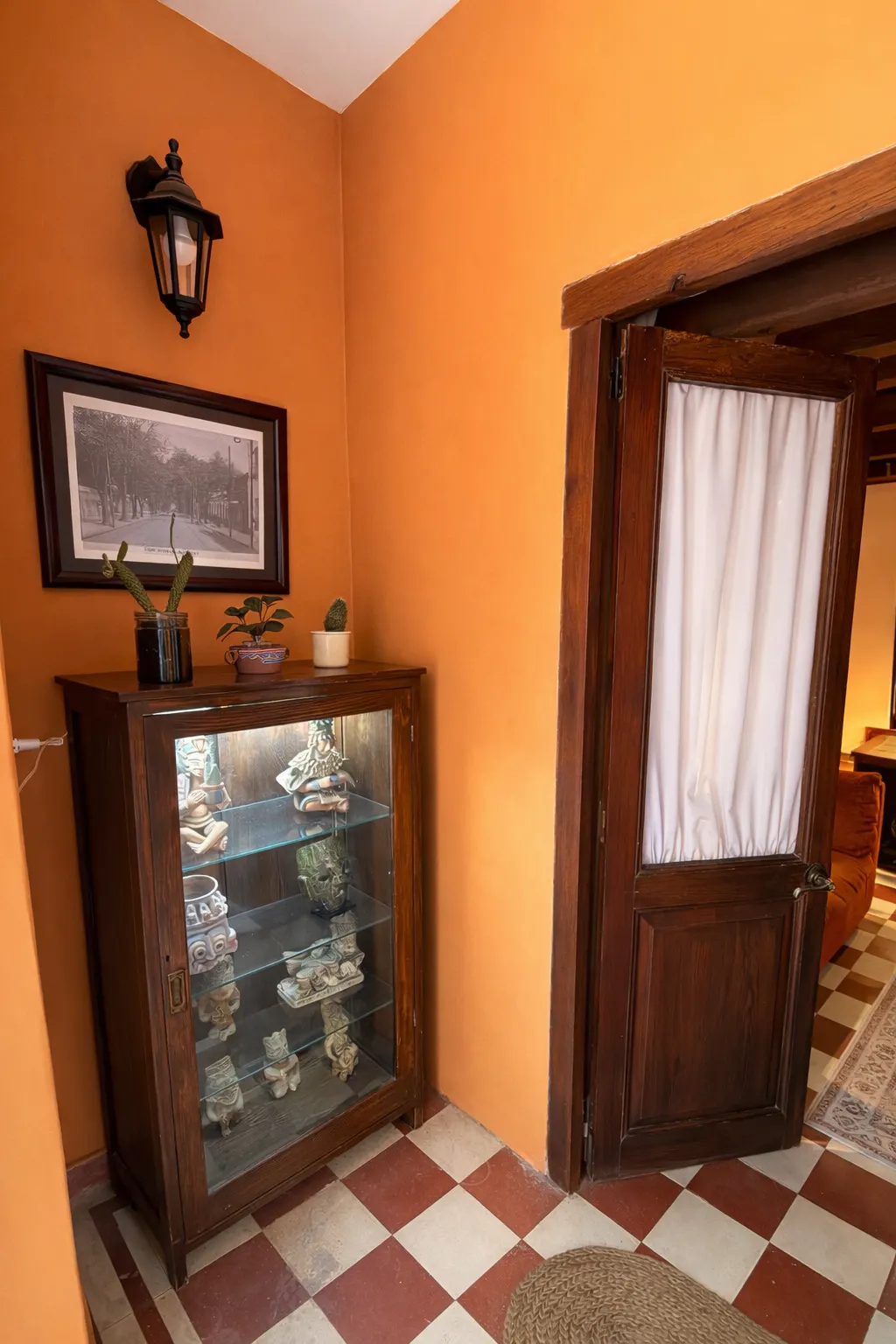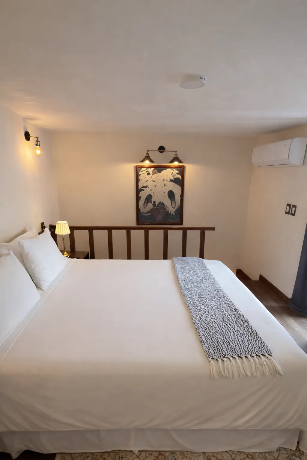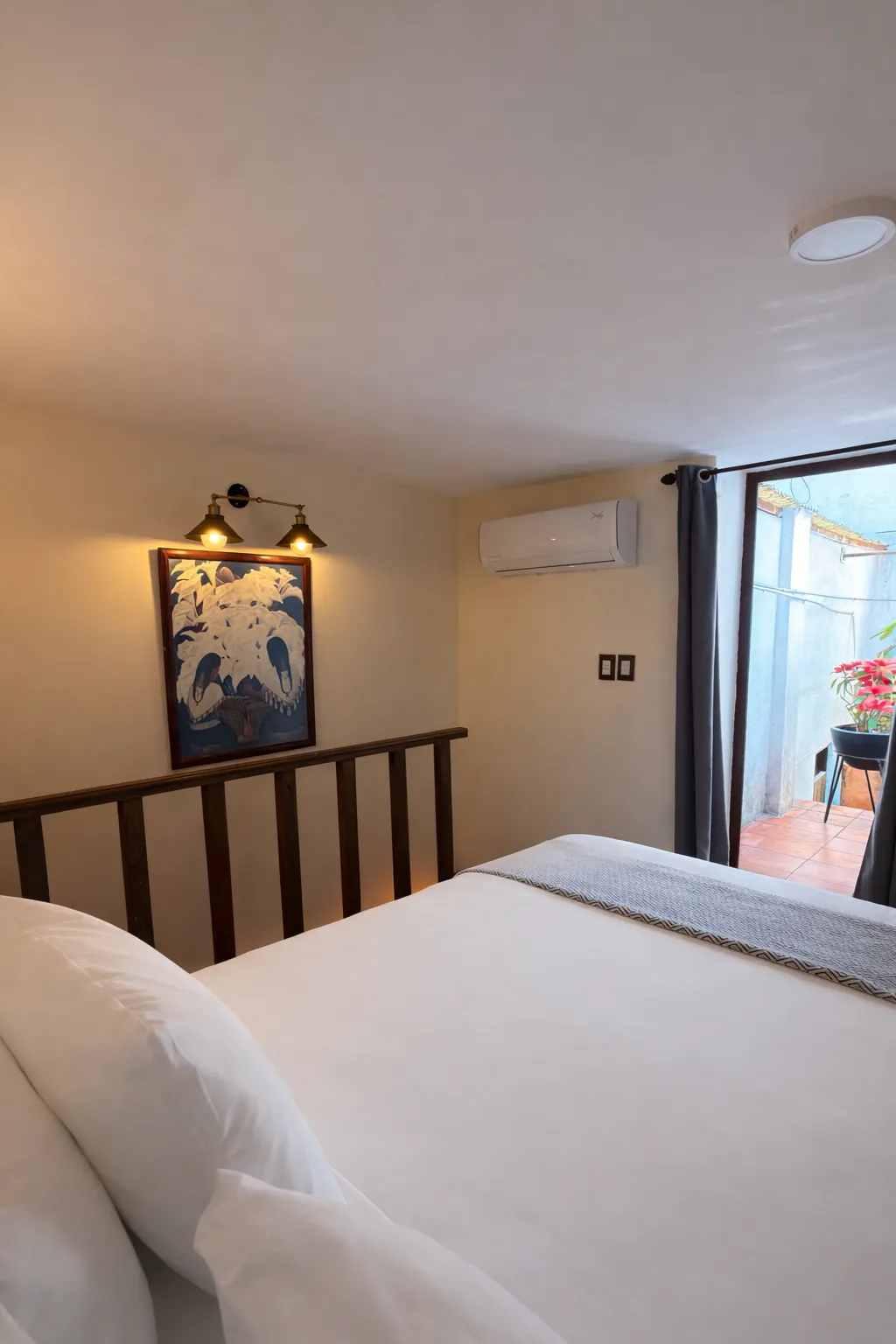 Subiendo por las escaleras, llegarás a la recámara, un espacio acogedor con un balcón privado interno que permite disfrutar de aire fresco. La mezcla de decoración vintage con detalles que conservan la esencia colonial de la Ciudad de México crea un ambiente cálido y auténtico, donde cada elemento cuenta una historia y contribuye al confort de quienes se alojan en ella.
