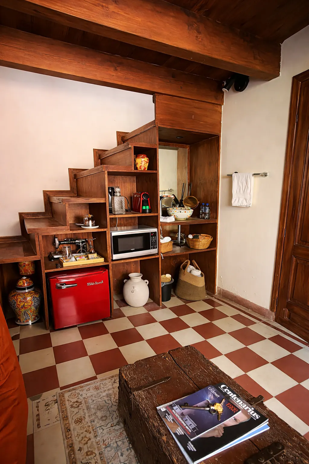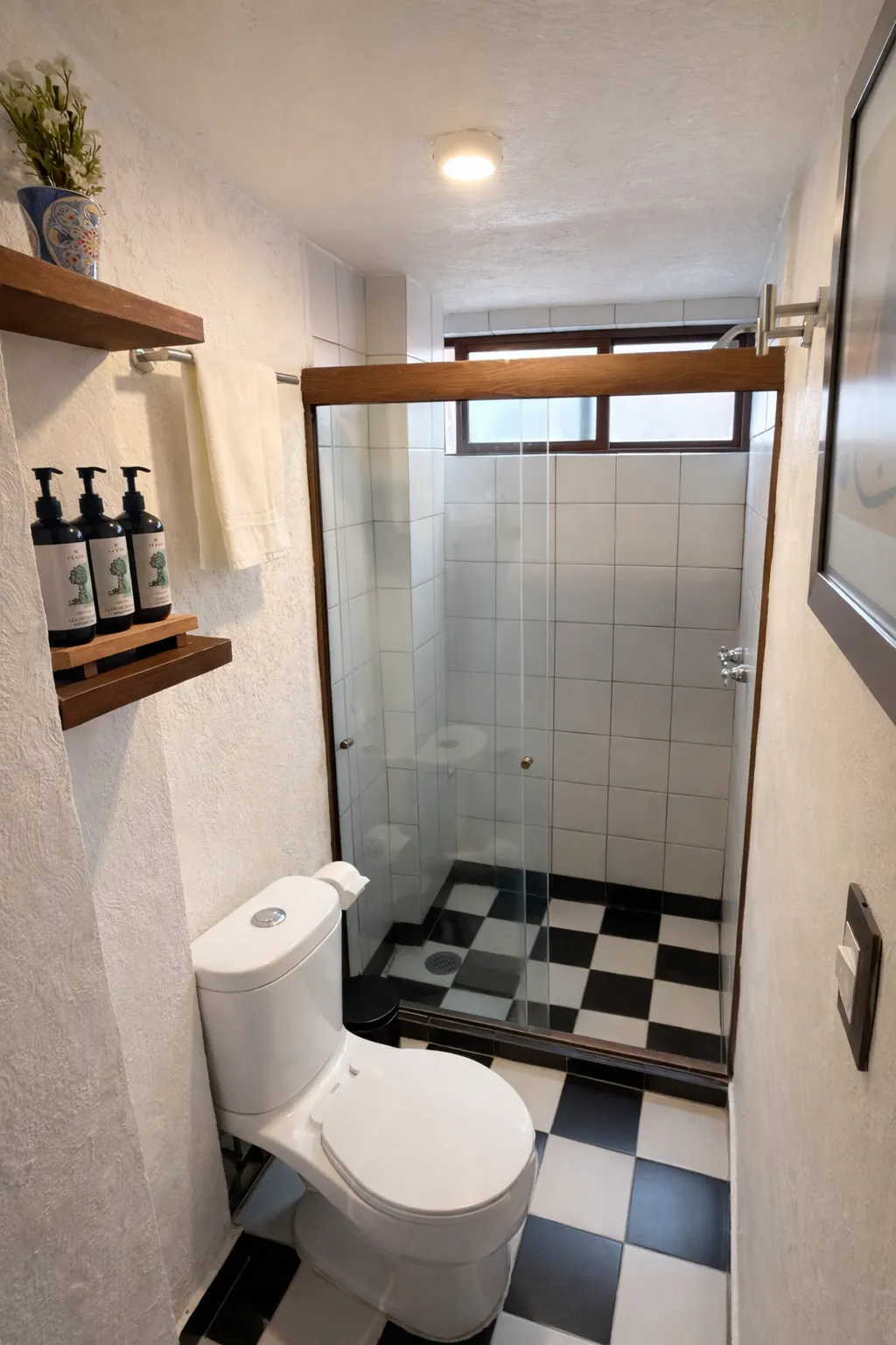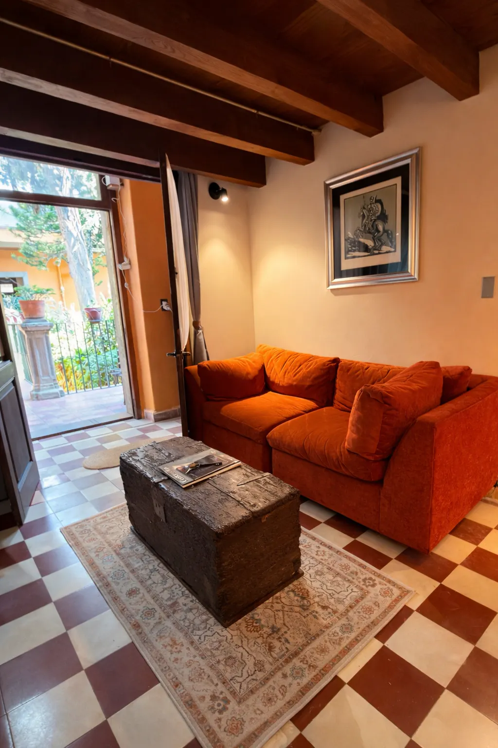 Subiendo por las escaleras, llegarás a la recámara, un espacio acogedor con un balcón privado interno que permite disfrutar de aire fresco. La mezcla de decoración vintage con detalles que conservan la esencia colonial de la Ciudad de México crea un ambiente cálido y auténtico, donde cada elemento cuenta una historia y contribuye al confort de quienes se alojan en ella.