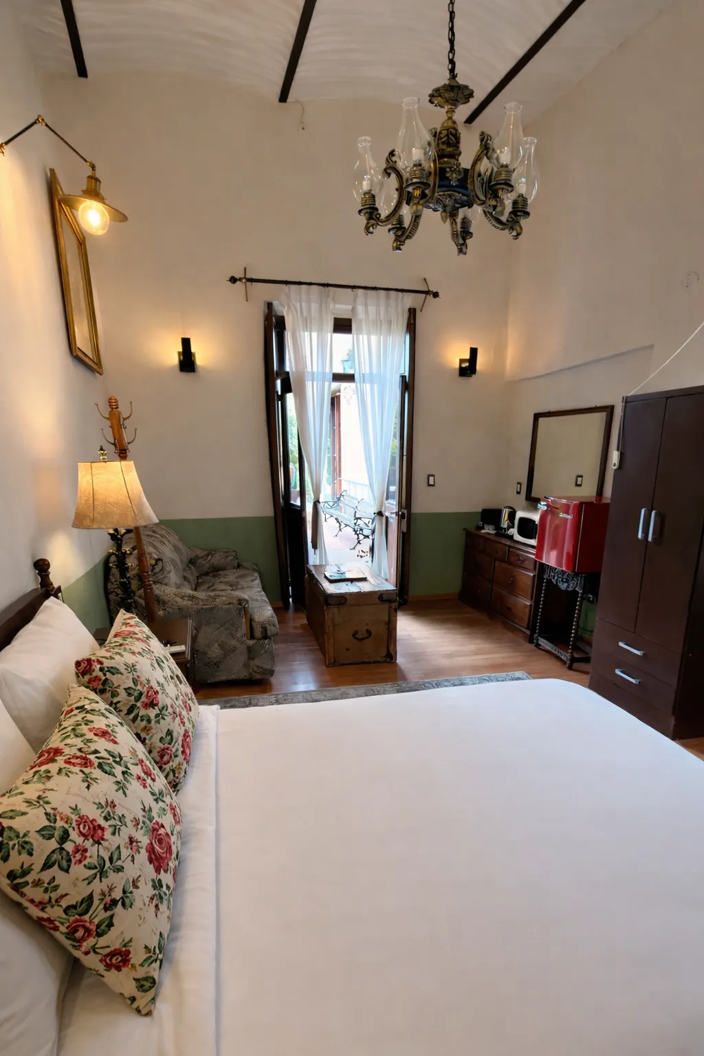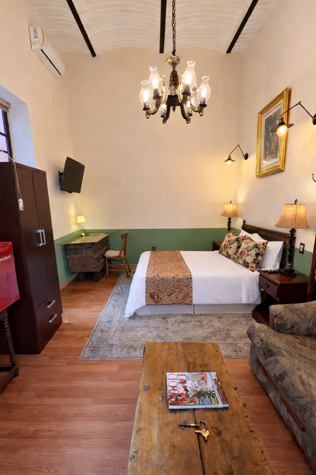 Con una altura de 4 metros, la suite se distingue por su ambiente amplio y luminoso, acentuado por un hermoso candil antiguo que recuerda la elegancia de siglos pasados. En ella, los detalles históricos se mezclan armoniosamente con modernas comodidades. La suite cuenta con una tina de baño antigua y ducha, donde podrás disfrutar de un relajante baño que evoca la atmósfera colonial, mientras experimentas la comodidad y la funcionalidad de los tiempos actuales.