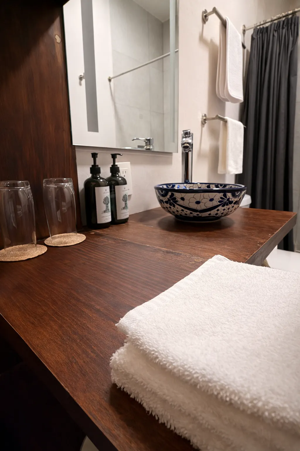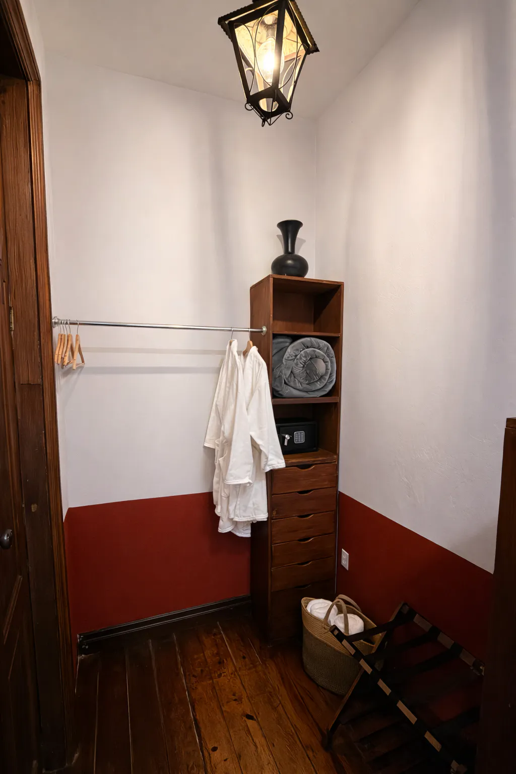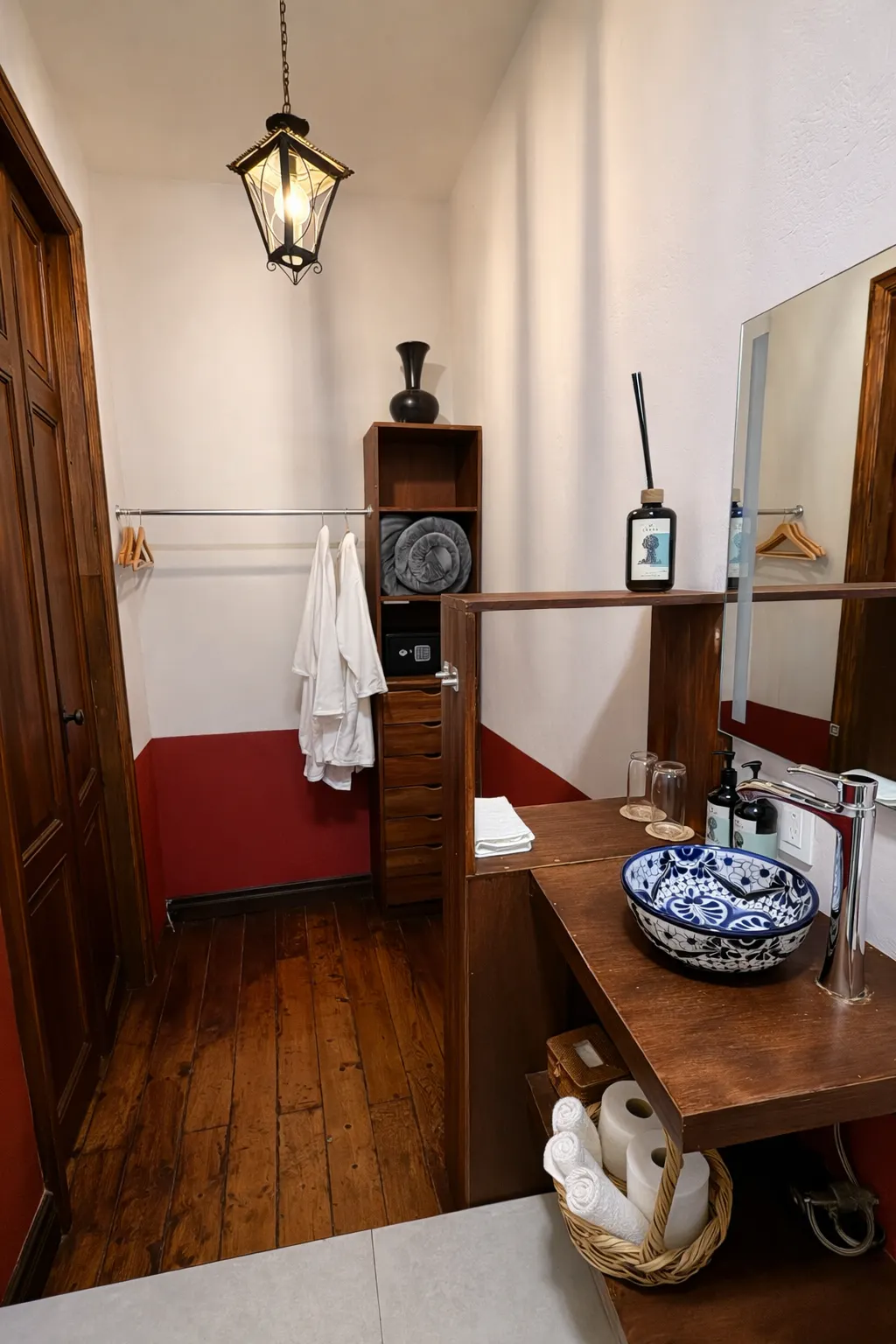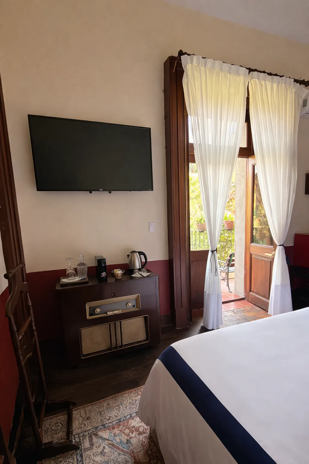 Esta habitación, que originalmente fue una recámara, destaca por su impresionante doble altura, que la hace sentir aún más amplia y luminosa, creando un ambiente único de relajación y confort. El piso de madera original, cuidadosamente conservado, agrega un toque cálido y auténtico, mientras que las puertas de madera originales con sus elegantes cortinas de madera ofrecen la posibilidad de abrirse completamente, permitiendo que te conectes y relajes con la belleza natural del jardín y poder disfrutar de una experiencia única al tomar un delicioso café o desayunar en una mesa exclusiva para la habitación, en un entorno que invita a la tranquilidad y al descanso. Este espacio es ideal para aquellos que buscan un refugio en medio de la ciudad, rodeados de naturaleza y la historia de la propiedad.