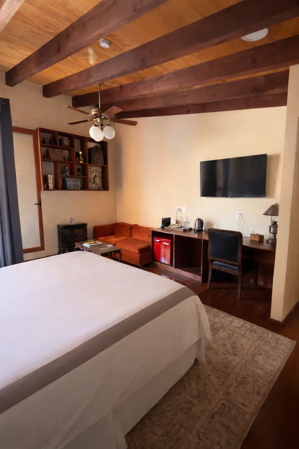 La suite cuenta con una amplia cama King Size, perfecta para garantizar un descanso profundo. El baño es una experiencia en sí misma, con una bañera antigua que evoca la elegancia de épocas pasadas y una regadera separada para mayor comodidad. Además, podrás disfrutar de entretenimiento de primera clase con un Smart TV y relajarte con una taza de café recién preparado gracias a la cafetera Nespresso.