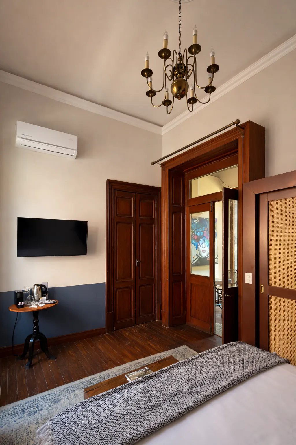 La doble altura de la habitación aporta una sensación de amplitud y luminosidad que, combinada con un candil elegante, crea un ambiente de distinción y majestuosidad. El diseño de la suite respeta la identidad colonial de la casa, pero con la comodidad y el lujo de hoy en día, convirtiéndola en un espacio único y exclusivo.